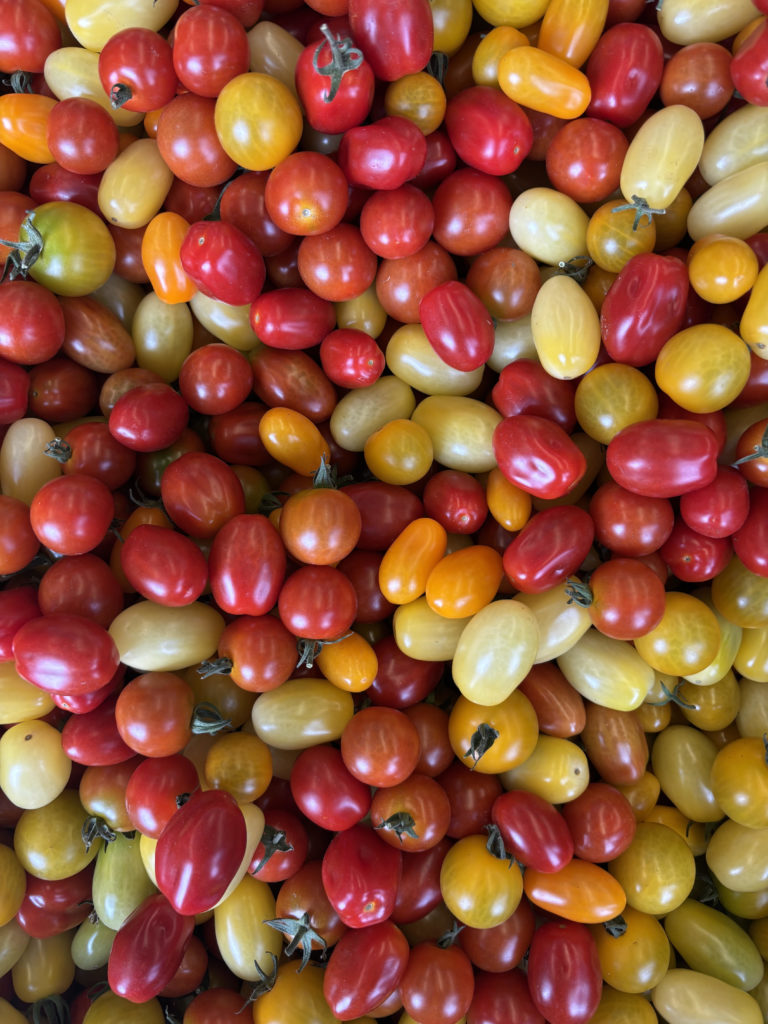 Tomates cerise, tomates Poala (classiques), tomates variées, (Noire de crimée, Cornille des Andes, Coeur de Boeuf, Ananas, Lemon Boy, Verte zébrée, cocktail…), Aubergines, poivrons verts et rouges, poivrons longs rouges, courgettes vertes, carottes, nouveau poireaux, potimarron, butternut, potiron, patidou, Be little Jack, Baby boo, céleri branche.
